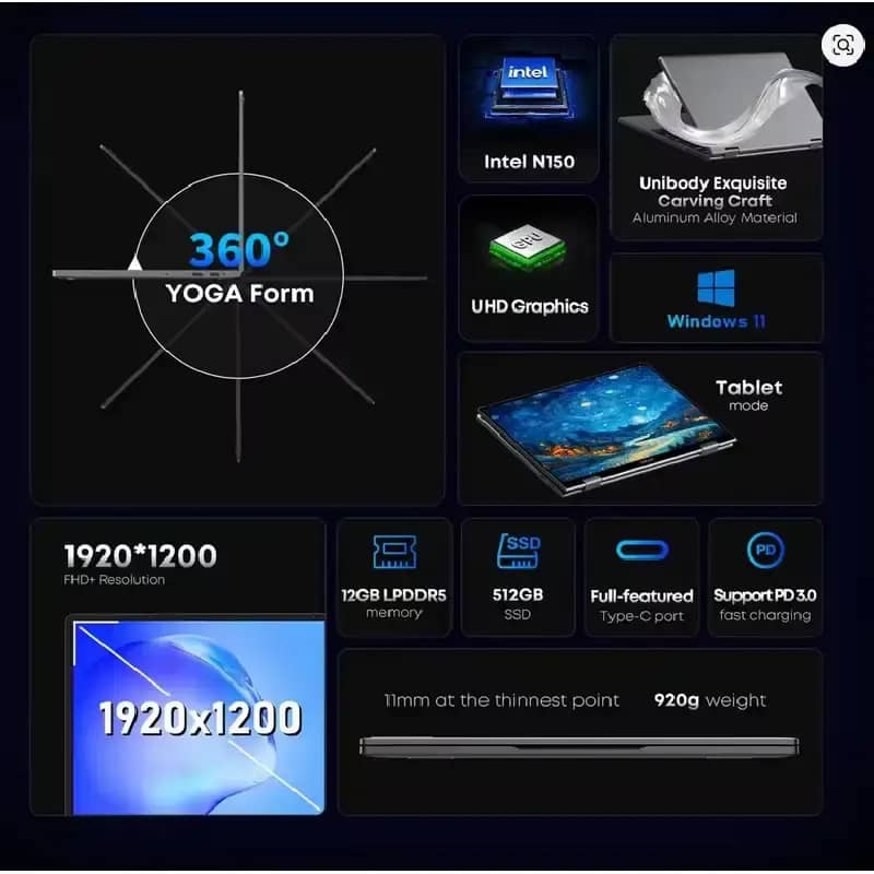 Prosesor: Didukung oleh Intel N150 Quad-Core yang hemat daya, MiniBook X memberikan performa optimal untuk multitasking. Penyimpanan: Dilengkapi dengan RAM 16GB LPDDR5 dan SSD 512GB, menjamin respon cepat dan ruang yang cukup untuk semua file penting Anda. Stylus Support: Ideal untuk yang suka menulis, menggambar, atau tanda tangan digital. Portabilitas: Bobot ringan hanya 890g dan ketebalan 1.7cm membuatnya mudah dibawa bepergian. Kamera & Audio: Kamera depan 2MP dan speaker stereo memudahkan video call dengan audio yang jernih. Koneksi: Terhubung dengan lancar melalui WiFi 6 dan Bluetooth 5.2, menyediakan konektivitas cepat dan stabil. Baterai: Baterai 26.6Wh tahan lama dengan pengisian daya USB-C memastikan laptop siap digunakan kapanpun.