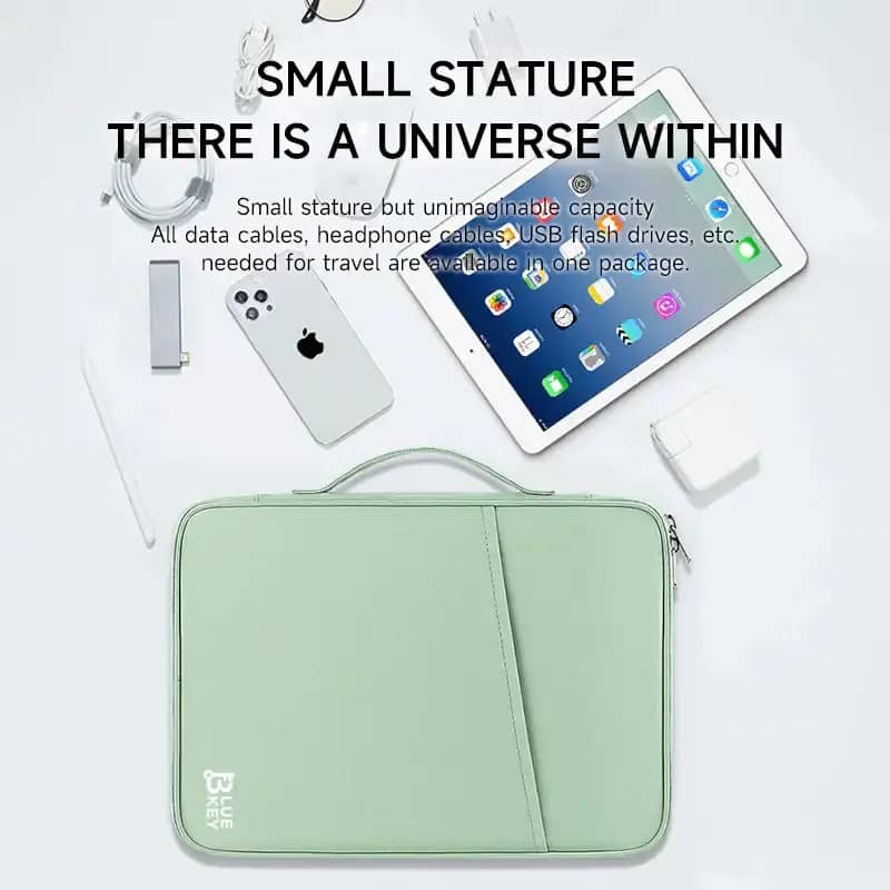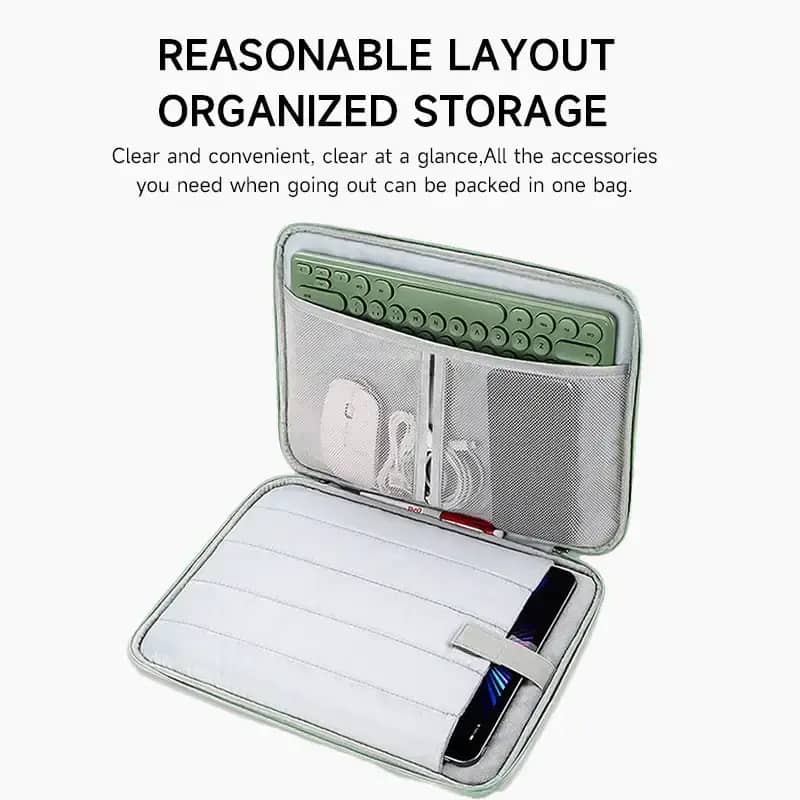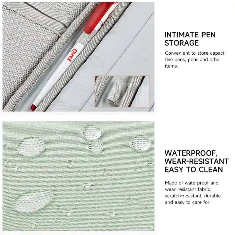 Fitur: - Material: Dibuat dari bahan nilon berkualitas tinggi, tas ini tahan terhadap goresan dan air, memastikan perlindungan maksimal untuk gadget Anda. - Desain: Dilengkapi dengan resleting ganda metal yang memungkinkan pembukaan 180°, sehingga memudahkan untuk mengakses barang-barang Anda. Velcro menjaga agar barang tetap pada tempatnya. - Kapasitas: Kompartemen utama dapat menyimpan tablet atau iPad, sementara kantong jala transparan dapat digunakan untuk menyimpan mouse, kabel data, atau headphone. Terdapat juga kompartemen khusus untuk pena, menjadikannya organizer yang serbaguna. - Mobilitas: Dilengkapi dengan pegangan yang kuat dan tahan lama, sangat ideal untuk dibawa saat perjalanan bisnis tanpa perlu khawatir kehilangan aksesoris Anda.