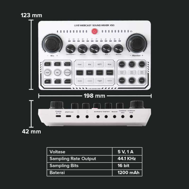 Spesifikasi: - Port I/O: USB, OTG/PC Live, Audio, Earphone, Headset, dan 2 Mic Condenser - Voltase: DC 5V, 1A - Dimensi: 198 x 123 x 42 mm - Baterai: 1200 mAh