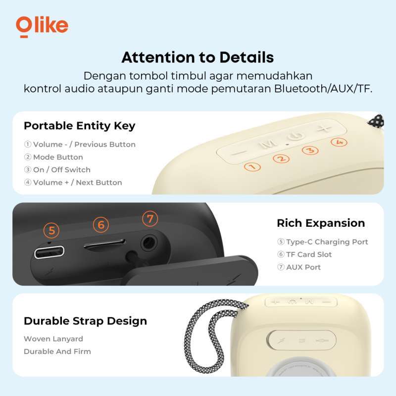 Tingkatkan momen mendengarkan musik Anda dengan OLIKE Speaker Mini Wireless SF7. Ini bukan sekedar speaker, tetapi pengalaman suara yang mengesankan untuk setiap saat.