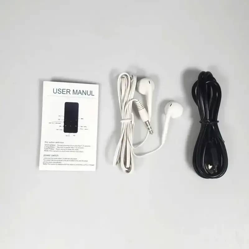MP3 Digital Audio Player, Kabel Micro USB, Earphone, Kotak Penyimpanan, dan Panduan Penggunaan.