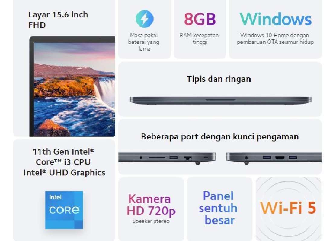 Laptop ini dilengkapi dengan kamera 720P HD untuk kebutuhan video call, serta keyboard ukuran penuh dengan "key travel" 1.5 mm untuk kenyamanan mengetik. Desain ringkas dengan berat hanya 1.8 kg, membuatnya mudah dibawa ke mana saja. Dengan daya tahan baterai yang kuat dan kemampuan pengisian cepat, Laptop RedmiBook 15 siap menemani aktivitas Anda sepanjang hari.