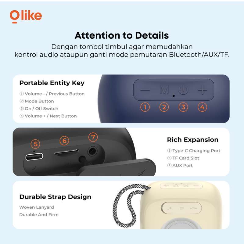 Jadikan OLIKE SF7 Mini Wireless Speaker sebagai teman setia Anda dalam aktivitas sehari-hari, dan nikmati kebebasan mendengarkan musik dengan kualitas suara yang memukau di segala kesempatan.