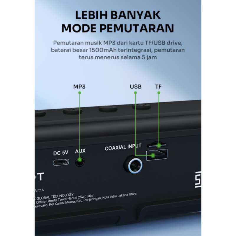 Konektivitas: Dilengkapi dengan teknologi Bluetooth 5.3, AUX 3.5mm, S/PDIF COAXIAL, dan MicroSD, memungkinkan Anda menghubungkannya dengan mudah ke berbagai perangkat hiburan Anda.