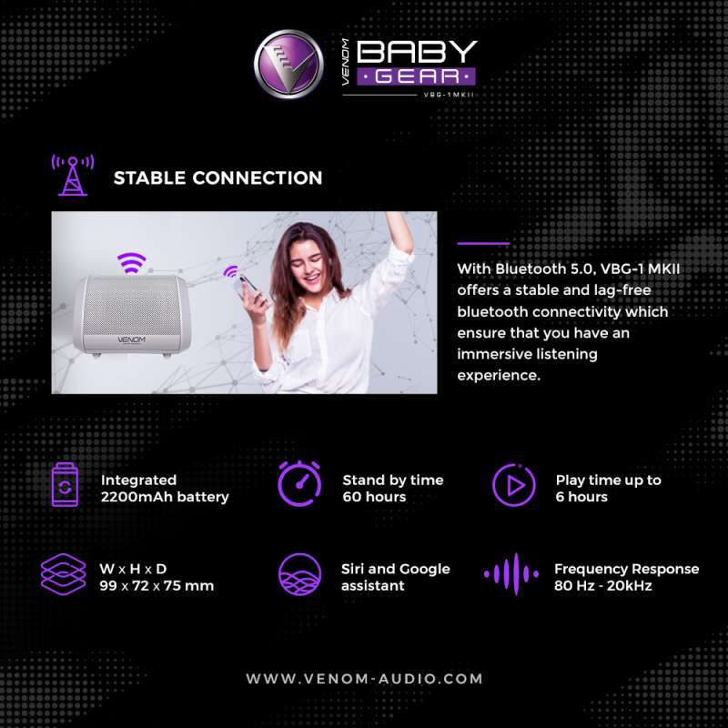 Miliki Venom Baby Gear VBG-1 MKII sekarang dan rasakan sendiri kualitas audionya. Pilihan tepat untukmu yang mencari speaker ringkas namun bertenaga.