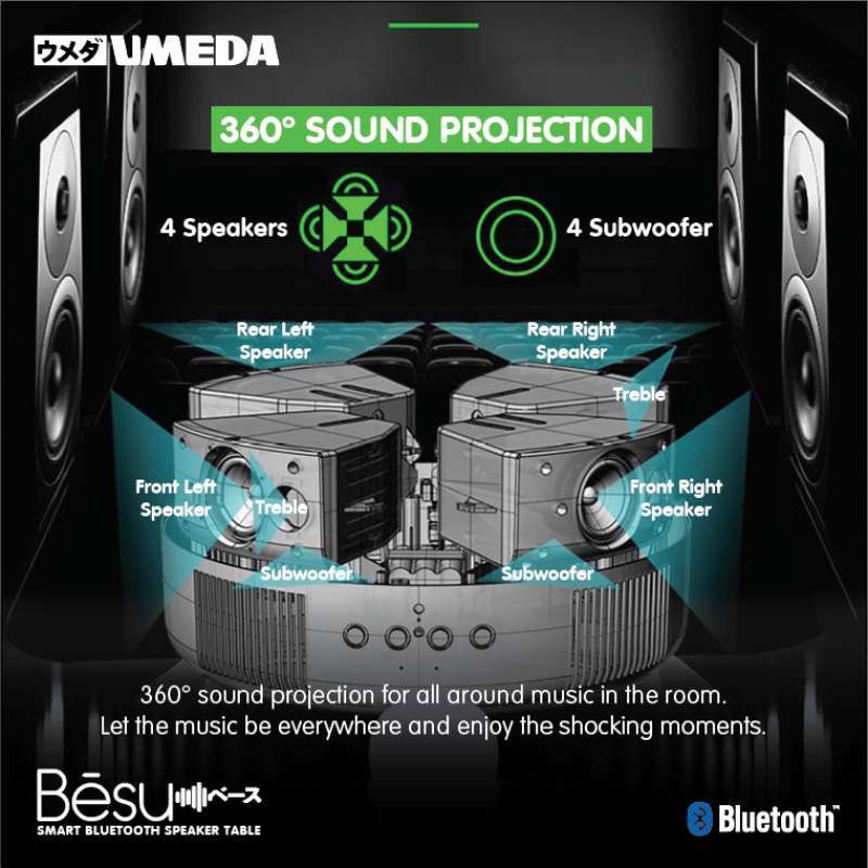 Temukan keunggulan Umeda BESU Bluetooth Speaker Table, dirancang untuk memperkaya suasana di rumah atau kantor Anda. Meja ini tidak hanya berfungsi sebagai meja kopi minimalis, tetapi juga sebagai sistem audio canggih yang menghadirkan pengalaman suara surround 360°. Dengan 88 watt suara stereo yang kuat, BESU memadukan tweeter dan empat radiator bass untuk memastikan audio yang jernih dan bass yang mendalam.