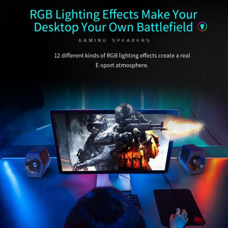 Mode Suara: Pilih mode Musik, Game, atau Film untuk menyesuaikan suara dengan kebutuhan Anda. EQ profesional memastikan kualitas suara yang optimal untuk setiap mode. Konektivitas: Dapatkan fleksibilitas dengan koneksi Bluetooth, USB sound card, atau input AUX 3.5mm untuk dihubungkan ke komputer, desktop, atau smartphone Anda. Suara Hi-Fi: Dengan unit full frequency berukuran 2.75 inch, speaker ini menghasilkan suara treble yang jernih dan bass yang bertenaga, cocok untuk memenuhi ruangan kecil. Dekorasi dan Cahaya: Sesuaikan tampilan desktop Anda dengan efek cahaya RGB yang dapat diubah dengan sekali tekan tombol.