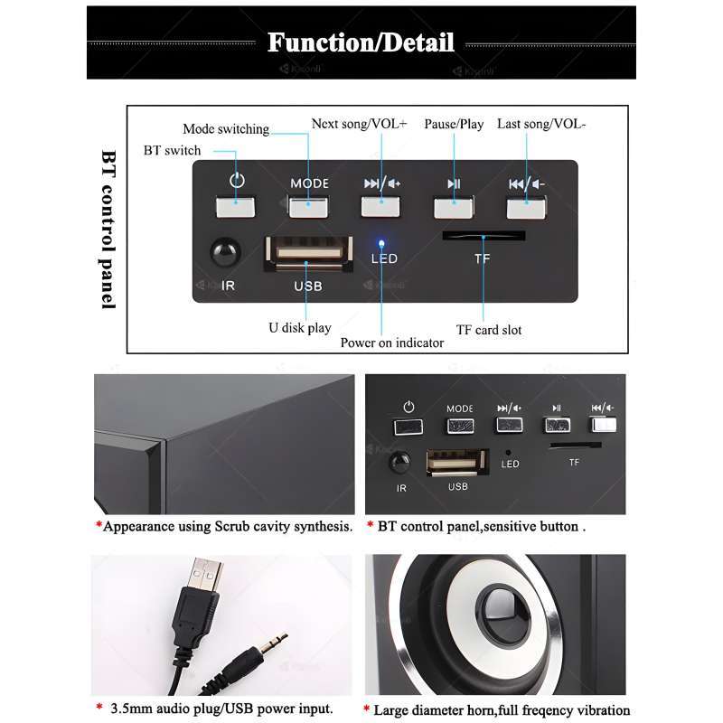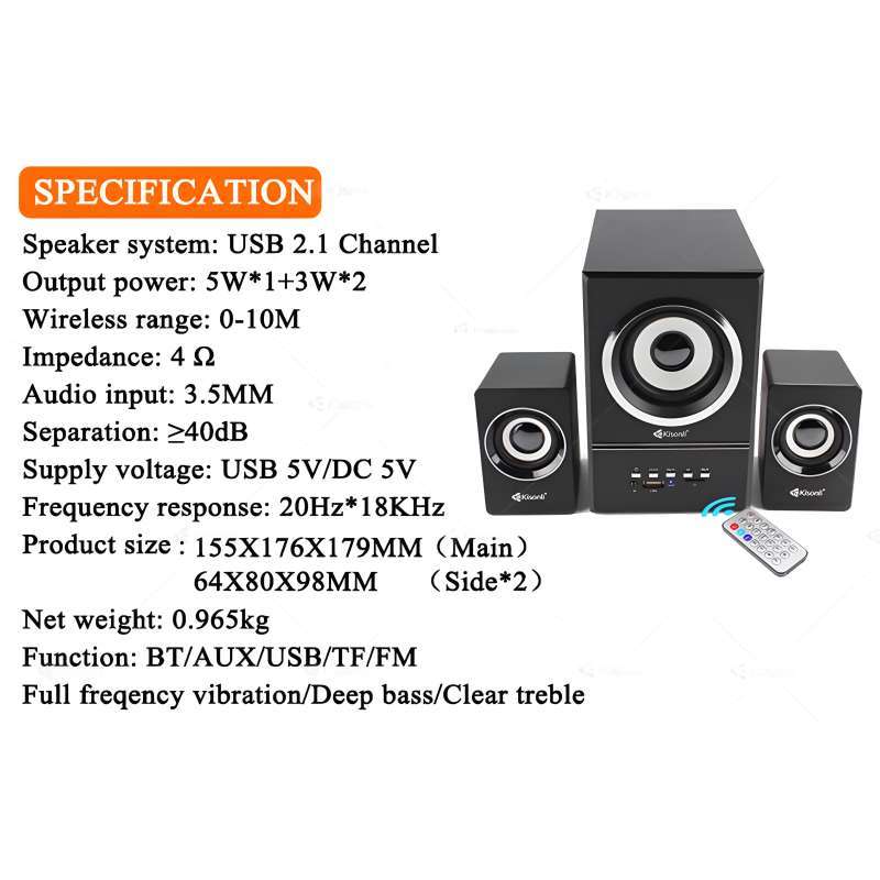 Koneksi: Speaker ini menggunakan koneksi kabel yang stabil dan kompatibel dengan berbagai perangkat melalui port AUX 3.5 mm. Kontrol Mudah: Dilengkapi remote control, memudahkan pengaturan volume dan penggantian mode sesuai keinginan Anda, tanpa perlu repot. Daya: Ditenagai oleh USB 5V, memastikan penggunaan daya yang efisien dan kompatibilitas dengan berbagai perangkat. Desain: Dengan sistem suara 2.1 channel dan subwoofer modern, dapat memberikan kualitas audio yang jernih dan bass yang mendalam. Fleksibilitas Penggunaan: Mendukung Bluetooth, USB, kartu memori, dan fungsi radio, memungkinkan Anda memutar musik dari berbagai sumber dengan mudah. Ukuran: Dimensi kompak (115 x 176 x 179 mm) dan berat ringan (1,175 kg), membuatnya mudah ditempatkan di ruangan mana saja.