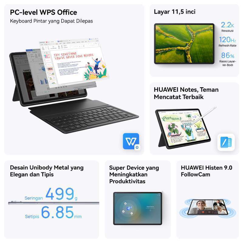 Keunggulan utama terletak pada layar 11,5 inci dengan resolusi 2200 x 1440 dan refresh rate 120Hz, memberikan tampilan visual yang mulus dan jernih untuk streaming atau tugas produktif lainnya. Dilengkapi dengan PC-level WPS Office dan HUAWEI Notes, tablet ini adalah teman terbaik untuk mencatat dan menyelesaikan pekerjaan di mana saja.