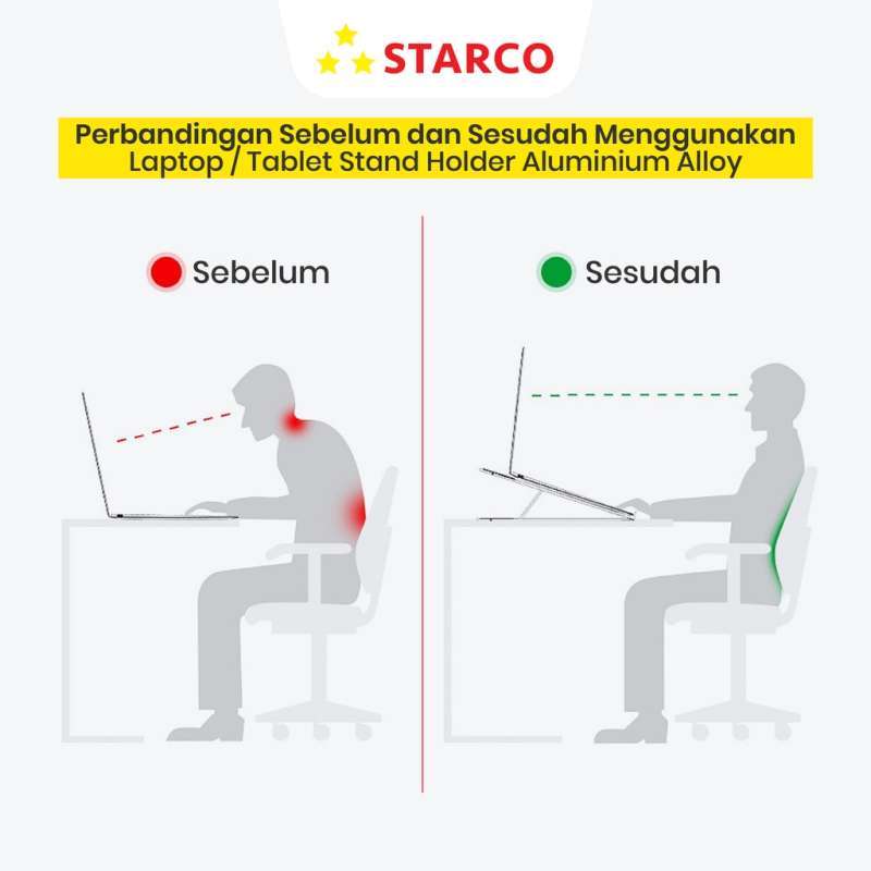 Temukan kepraktisan Dudukan Laptop/Tablet Starco Aluminium Alloy yang dirancang untuk mengurangi kelelahan saat menggunakan laptop. Dudukan ini adalah solusi ideal bagi Anda yang sering merasa pegal karena postur tubuh yang salah saat bekerja di depan layar.