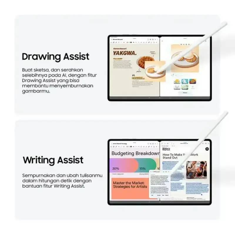 Layar: Dynamic AMOLED 2X berukuran 14,6 inci dengan resolusi 2960 x 1848 piksel, memastikan tampilan jernih dan warna tajam tanpa pantulan. RAM & Memori: Dilengkapi dengan RAM 12GB dan ROM 256GB, dapat diperluas hingga 2TB, memberi Anda ruang penyimpanan luas untuk semua aplikasi dan file penting. Kamera: Kamera utama 13MP dan kamera depan 12MP menghadirkan kualitas foto dan video kelas atas, termasuk kemampuan rekaman video UHD 8K. Audio & Konektivitas: Didukung oleh empat speaker Dolby Atmos untuk pengalaman audio imersif, serta koneksi 5G dan WiFi 7 untuk internet cepat dan stabil. Baterai: Kapasitas baterai 11,600mAh dengan pengisian cepat 45W menjaga perangkat tetap aktif sepanjang hari.