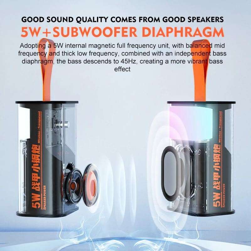 Temukan keunggulan Speaker Bluetooth Mecha Mini 5W Transparan Audio LED Rhythm TWS 5.0. Dirancang untuk mereka yang menginginkan pengalaman audio yang imersif dan praktis tanpa kabel, speaker ini akan meningkatkan cara Anda menikmati musik.